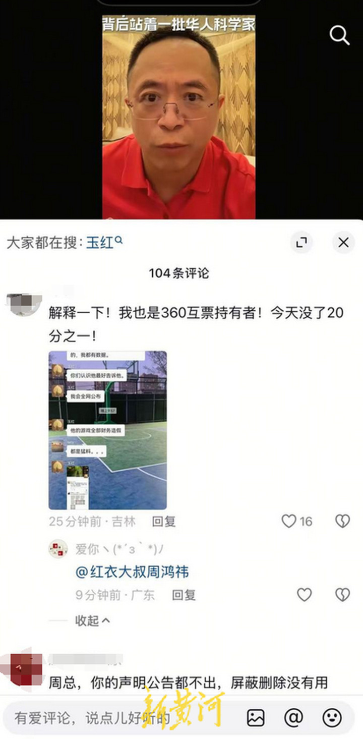 这条视频的评论区出现大量投资者留言。新黄河记者注意到,多名用户贴出了玉红的爆料截图,要求周鸿祎“解释一下”。还有人自称持有360股票,“今天大跌”。另有投资者留言询问公司为何不对玉红的言论进行回应或索赔。